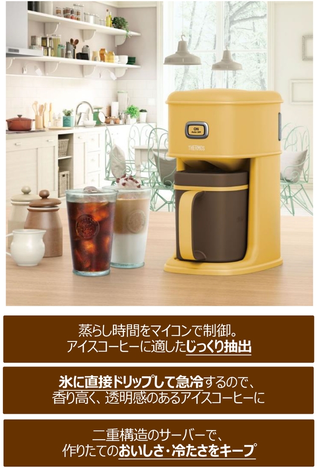 本製品は、アイスコーヒーの抽出に最適な専用設計で、香り高く透明感のあるアイスコーヒーを自宅で簡単・手軽に楽しめる、アイスコーヒー専用のコーヒーメーカーです。マイコンで蒸らし時間を制御し、氷に直接ドリップして急冷することで香り高く透明感のある仕上がりに。二重構造のサーバーにドリップするから冷たさ長持ち、作りたてのおいしさをキープします。シンプルな構造で操作もお手入れも簡単。自宅で手軽においしいアイスコーヒーが飲めると好評を博しています。