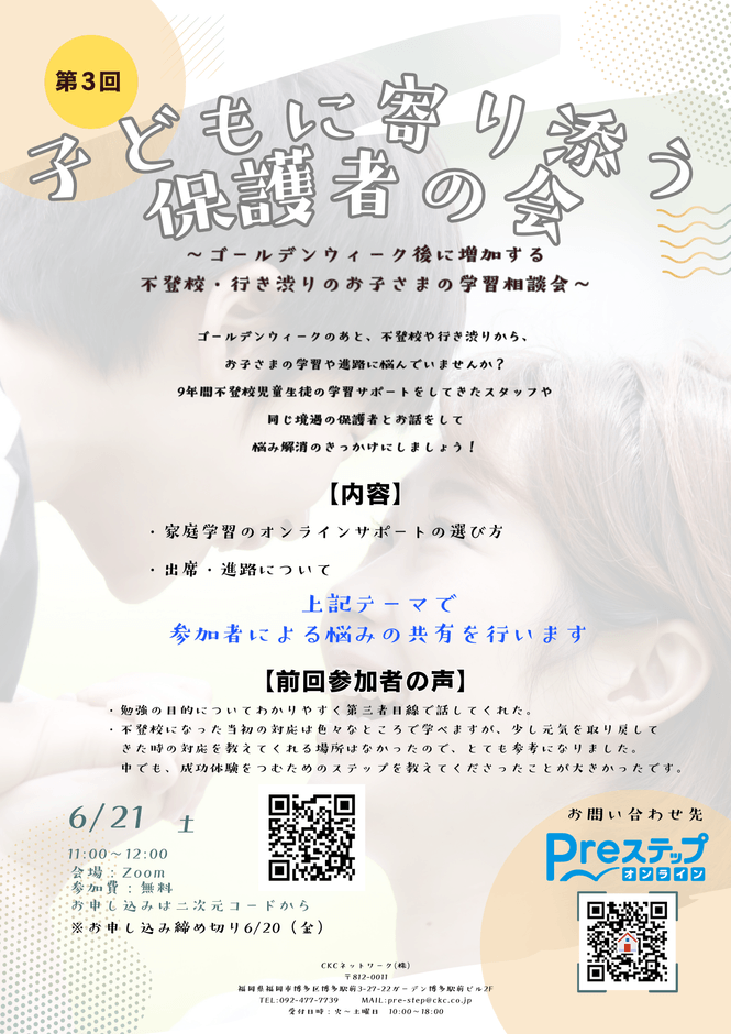 CKCネットワーク株式会社(代表取締役:山崎 朋宏、本社:愛知県名古屋市 Preステップオンライン運営支社:福岡県福岡市)が主催する「第3回子どもに寄り添う保護者の会」を6月21日(土)にオンラインで開催することになりましたので、お知らせいたします。