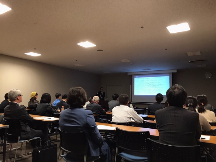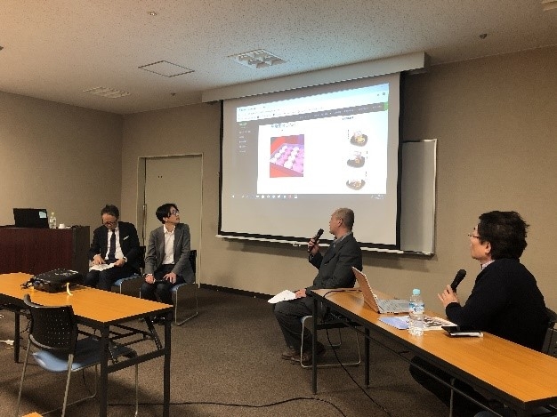 前半は、売れる商品やサービスを作るためのブランディングや、企業同士のコラボレーションについて池内氏がアドバイスした商品などの実例をもとに解説。後半は、地域プロデューサーの本田勝之助氏と福山ビジネスサポートセンターの高村亨氏、そして事業者を交えパネルディスカッションを行いました。事業者などの相談に対し、「良くて」「他と違う」商品作りや、ターゲットにあったパッケージデザインの工夫方法など具体的なアドバイスをしていただきました。講演会には、ものづくり事業者ら34名が参加し、事業者同士の接点の場としても活用されました。
