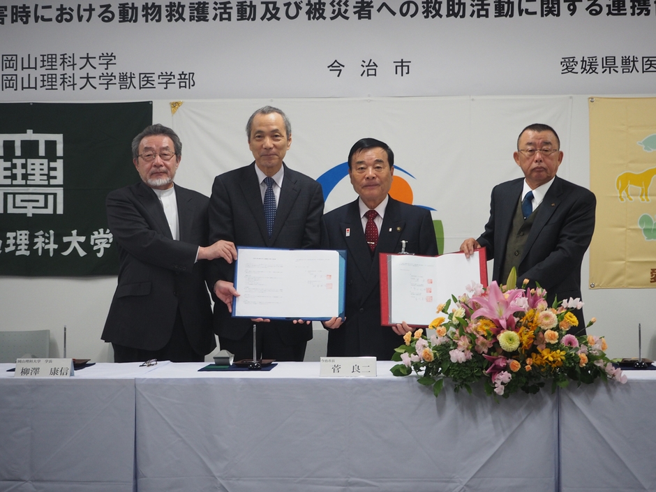 協定の締結式は今治市の理大今治キャンパス管理棟で行われ、菅良二・今治市長、寺町光博・愛媛県獣医師会会長、柳澤康信・岡山理科大学学長、吉川泰弘・獣医学部長らが出席し、2種類の協定書に署名・押印しました。