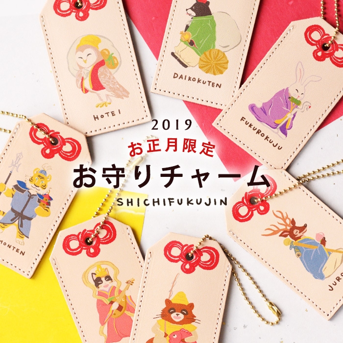お正月限定で姿を現す、HIRAMEKI.七福神を祀ったありがた~い神社。動物の姿をした神様たちが、初詣に参られた皆様を出迎えます。神社で販売している、お守り型のチャームは本革製。上質なヌメ革に七人それぞれの神様が描かれています。祈願したい神様を選んで、大切に持ち歩きましょう。中が本物のお守りのようにポケット状になっているので、大切な心決めや、小さなお守り、おみくじなどを入れることができます。