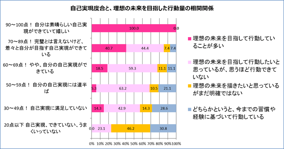 「自己実現度合」と、「理想の未来を目指した行動量」の相関関係を分析した結果、自己実現度合が70点以上の高い方は、自己実現度合が低い方と比べると、「理想の未来を目指して行動していることが多い」ことが分かりました(グラフ1)。自己実現度合が、50点から69点の中位の方は、「理想の未来を目指したいが、思うほど行動できていない」、つまり行動化が重要であることが分かります。自己実現度合が49点以下の、自己実現度合が低い方は、「理想の未来が明確ではない」、また「今までの習慣や経験に基づいた行動が多い」ことから、「理想の未来を具体的に描くこと」および、「過去の否定的な記憶や、経験からの考え方を癒すこと」がポイントと考えられます。