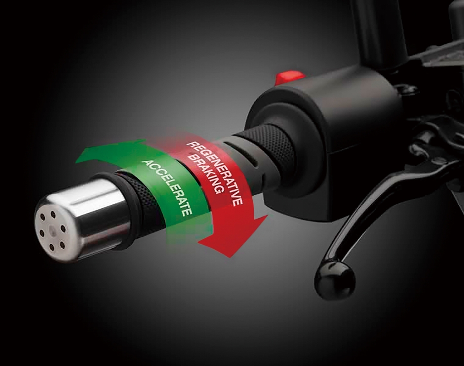 加速/減速/後退をスロットルだけで自在に操作することができる、アディバ独自の「マルチファンクションスロットル」を採用。走行状態でスロットル開度をゼロへ戻し、さらに逆方向に回転させると回生ブレーキが作動し、車体を減速させるとともにバッテリーへ補充電を行います。停止状態で逆回転させると車体を後退させることができ、駐車時などに役立ちます。