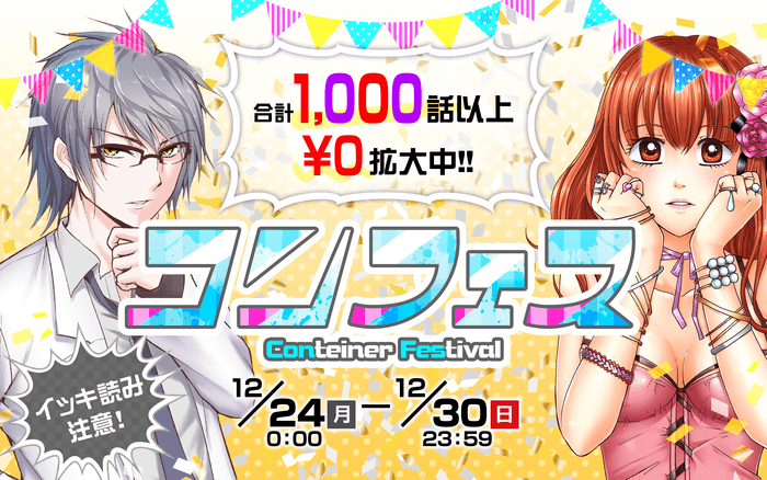 株式会社BookLive(本社:東京都港区・代表取締役社長:淡野 正、以下 当社)は、電子コミックアプリ「コミック コンテナ」において、「コンフェス(Container Festival)」を実施します。期間中、通常「待てば無料」で読める話など合計1,000話以上を無料で公開し、平成最後の年末年始の思い出作りを応援いたします。
