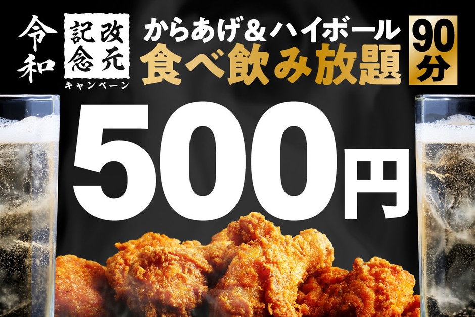 対象の全国11店舗にて、「令和最初の大盤振る舞い!からあげ食べ放題+ハイボール飲み放題ワンコインキャンペーン!」と題し、からあげ食べ放題とハイボール飲み放題60分間をワンコインの500円で提供いたします。