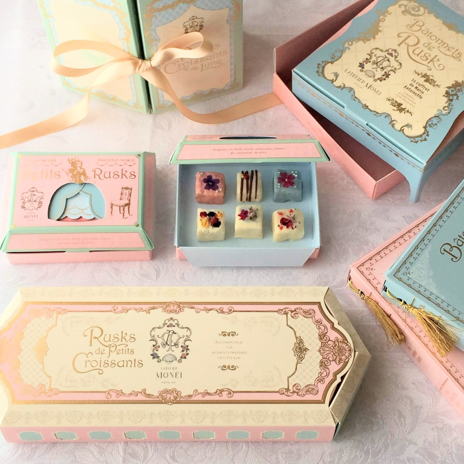 L'atelier Moneiのラスクは、ひとつひとつ、パティシエールが心を込めてデコレーションした手作りのお菓子です。「マリーアントワネットが愛したお菓子」を心に描き、エレガントで優美、おいしいラスクを作っております。