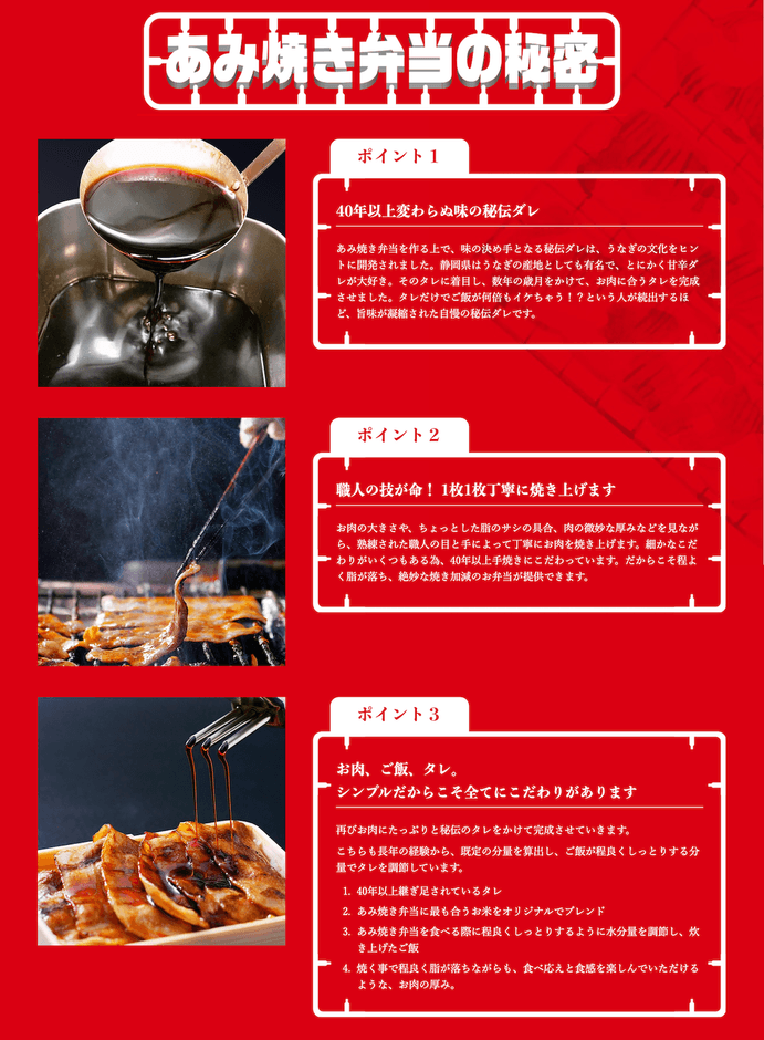 今回のリニューアルでは、静岡をピアノやプラモデルなど作り手の技術が光る「ものづくり県」と位置づけ、その文化の中で誕生した「あみ焼き弁当」の美味しさの秘密、こだわりを余すところ無く紹介しています。