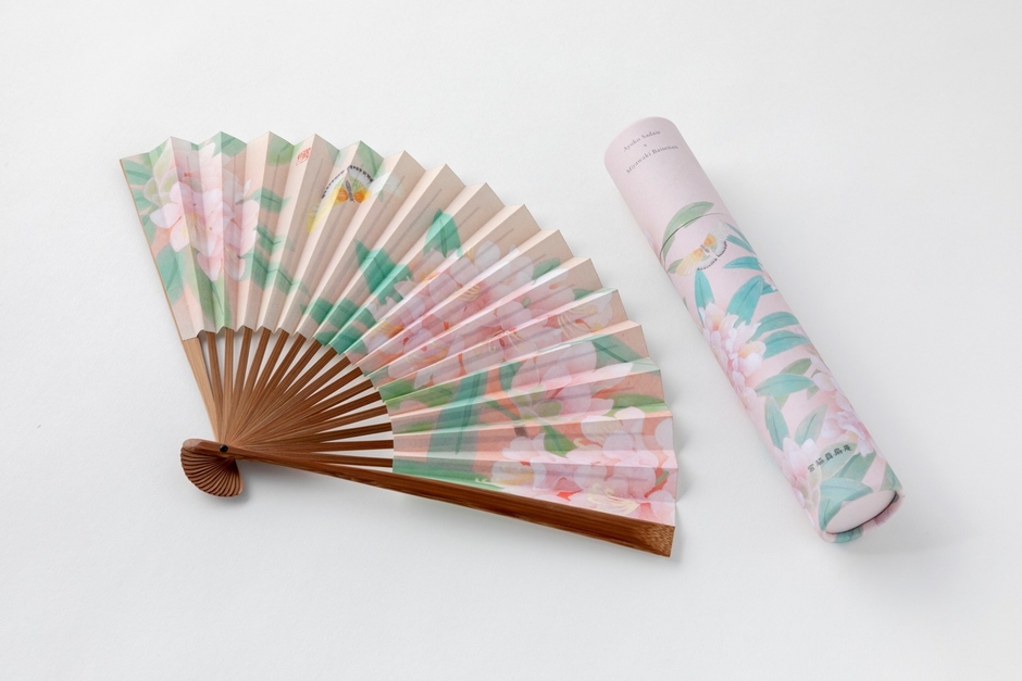いま注目の女性日本画家 定家亜由子氏が扇子のために書き下ろした図案がデザインされ、ピンク色の色彩で描かれたシャクナゲの花がとても美しい扇子です。女性でも男性でも使いやすい7寸という中間サイズで仕立てられています。色彩とその花の絵の美しさから、女性向けとも感じられますが、とても明るくポジティブなイメージが放たれる定家氏の日本画作品を好む男性にも、「日本画の作品を扇子の中に閉じ込めて持ち歩くことができる」と評判です。また商品のパッケージは同柄がプリントされた紙筒がとてもかわいらしく、持ち運びのケースとしても使える特別仕様になっています。年末には新たな図案による第2弾の発売も予定されています。