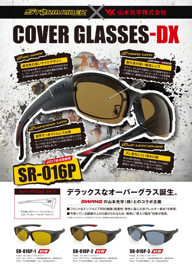『COVER GLASSES-DX』は、2013年に販売を開始したフィッシング専用サングラス「STORM RIDER(R)」の新作として、通常のサングラスとして使用していただく以外に、メガネの上からでも掛けることの出来るオーバーグラスタイプとなっております。