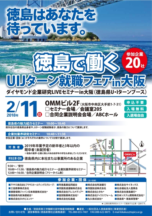 徳島県商工労働観光部労働雇用戦略課(徳島県徳島市)は、徳島県内での就職を希望している学生を対象にしたセミナー・合同企業説明会『徳島で働くUIJターン就職フェア』を、2018年2月11日(日・祝)に、大阪・OMMビル(大阪府大阪市中央区)にて、2月21日(水)に岡山コンベンションセンター(岡山県岡山市)にて開催します。