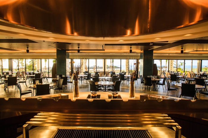 お食事会場の「ザ・グリル」は、ガラス窓の向こうにサンマリーナビーチが広がり、夕刻にはサンセットを一望出来るオーシャンフロントのレストランです。地産地消にこだわり県産和牛や地元漁港から直送される鮮魚などを仕入れ、客席の前に広がるオープンキッチンからお料理をご用意いたします。