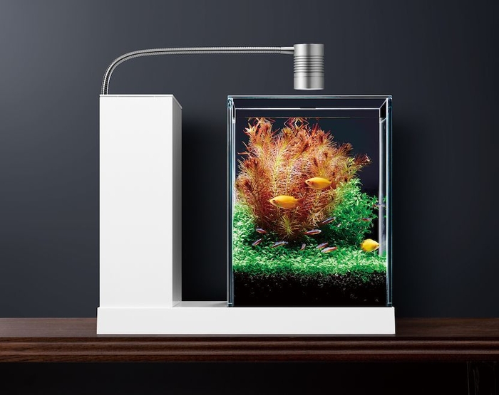 必要な機能をコンパクトにまとめた観賞用水槽。従来の水槽は、必要な器具を追加するたびに煩雑な見栄えとなっていたが、濾過槽を別体として機能を集約し、水槽本体には鑑賞対象のみを入れるという新しい構造を提案している点がすばらしい。