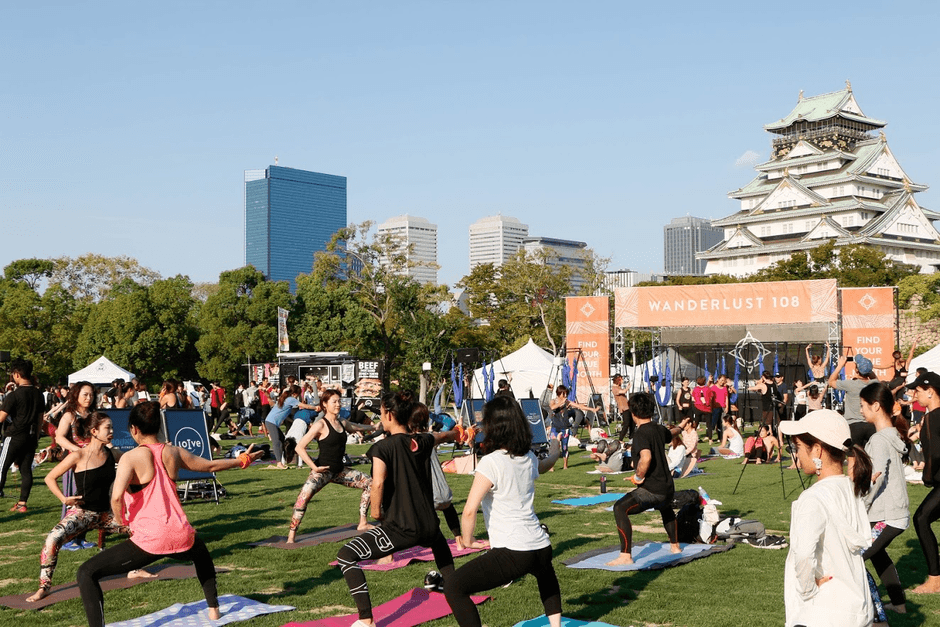 「WANDERLUST 108」は、2009年にカリフォルニアから始まり、世界17か国60都市で開催され、延べ約11万人が参加した国内最大規模のマインドフルネスイベントです。この度開催された大阪会場では、当社オリジナルのNEWレッスン「SUMO YOGA」を、大阪城をバックにした解放的な空間の中で、参加者とともに行いました。