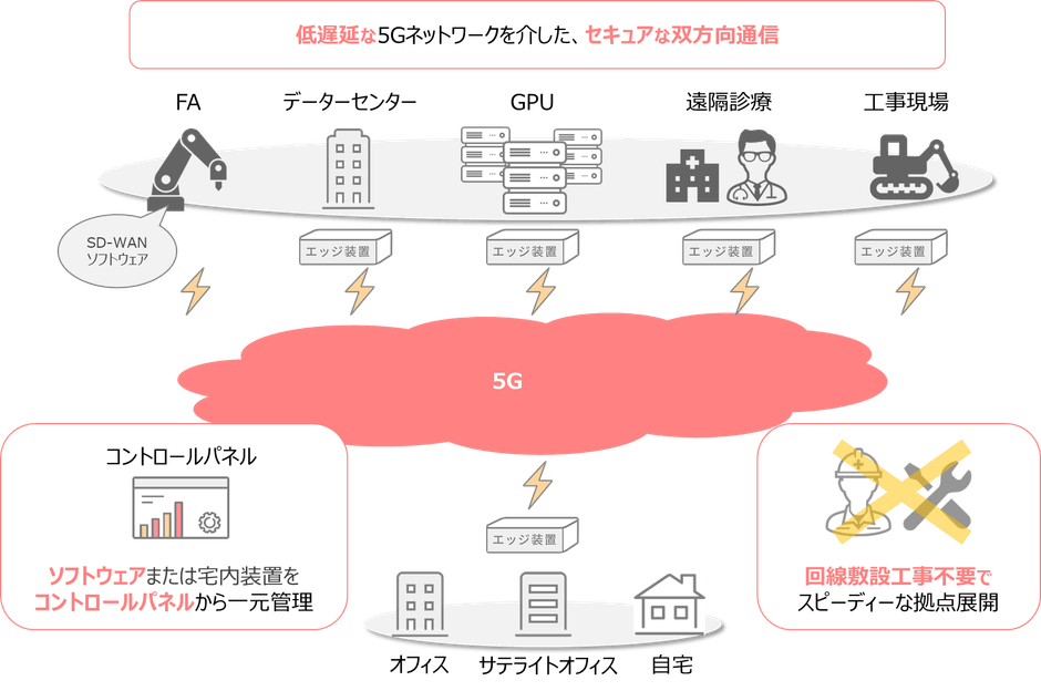 5Gネットワーク技術とSD-WAN技術を組み合わせることにより、従来型ネットワークの課題であった固定回線敷設時のリードタイム長期化や無線回線利用時の帯域不足を解決することが可能です。またコントロールパネルやAPIを利用した一元管理機能により、IoTをはじめとするよりフレキシブルなネットワーク利用が可能になると期待されます。
