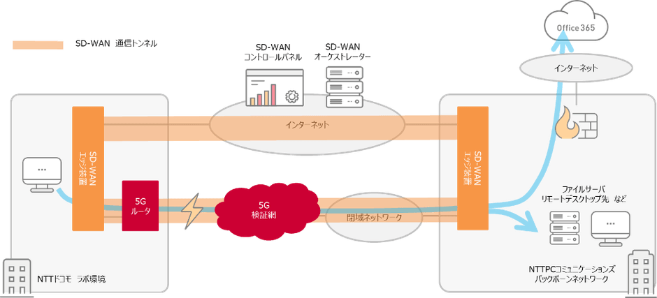 NTTPCは、さらなるネットワーク利用の高度化・複雑化を見据え、5GネットワークとSD-WAN技術との組み合わせによる相乗効果の確認を目的として、本実証実験を実施しました。