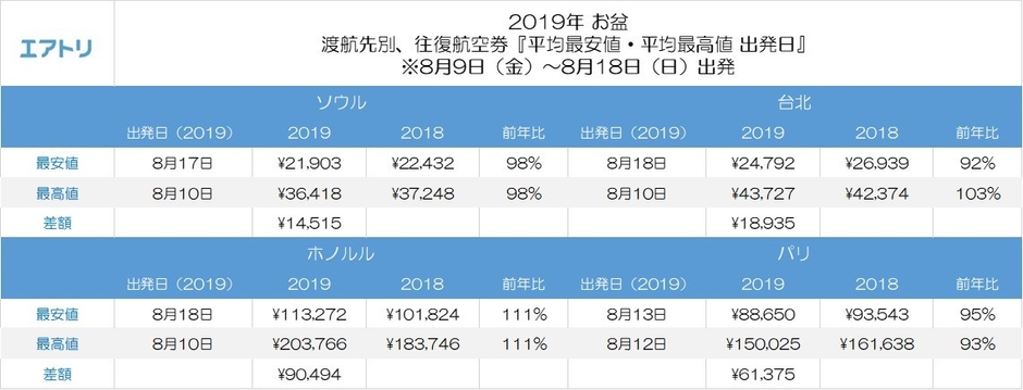 ソウル・台北・ホノルルに関してはお盆前半から後半にかけて金額が下がっており、ホノルルに関しては最高値と最安値で約9万円の差が出ました。一方、パリは日によって大きく変動しています。また最安値はソウル・台北・パリの3都市において昨年を下回っており、日程によってはお得に旅をすることができそうです。