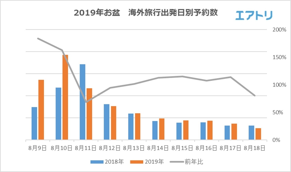 お盆時期の日本発海外航空券の予約件数は連休初日の8月10日(土)が最も多く、昨年対比でも163%となっています。続いて多いのが連休前日の8月9日(金)、8月11日(日)は前日8月10日(土)の6割程度となっており、その後は緩やかに減少しています。お盆前日と初日を避けるだけでも混雑はある程度回避できそうです。