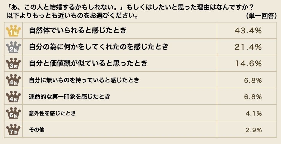 3位の「自分と価値観が似ていると思ったとき」とは反対に、自分に無いものを持っているお相手に強く惹かれたという回答が4位に入りました。お互いに持ってないものを補いあっていくのは「カップル」のひとつのあり方でしょう。もしかすると、「自分に無いもの」を求めるのは「男女」の関係の本質といえるのかもしれません。