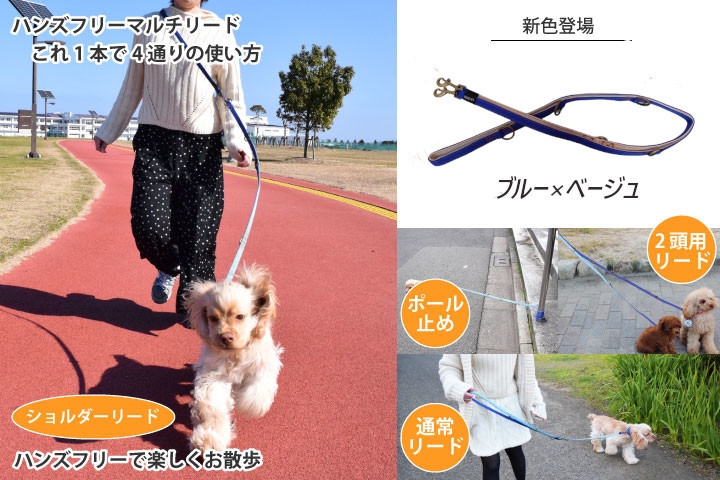 業務用ペット用ドライヤー「メガブロー」など製造販売する株式会社ベルミー(所在地:東京都台東区、代表取締役:仁藤 かほり)は、お散歩中の便利さを追求した4Wayリード「RURU PET ハンズフリーマルチリード」の新色『ブルー×ベージュ』を、2023年1月に発売開始します。