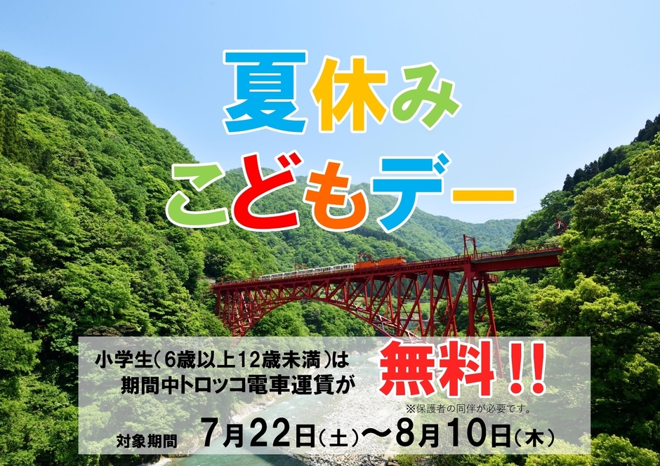小学生(6歳以上12歳未満)は「宇奈月⇔欅平間」及び「宇奈月⇔鐘釣間」の往復乗車券が無料になります。この夏、トロッコに乗って冒険へ出かけませんか?