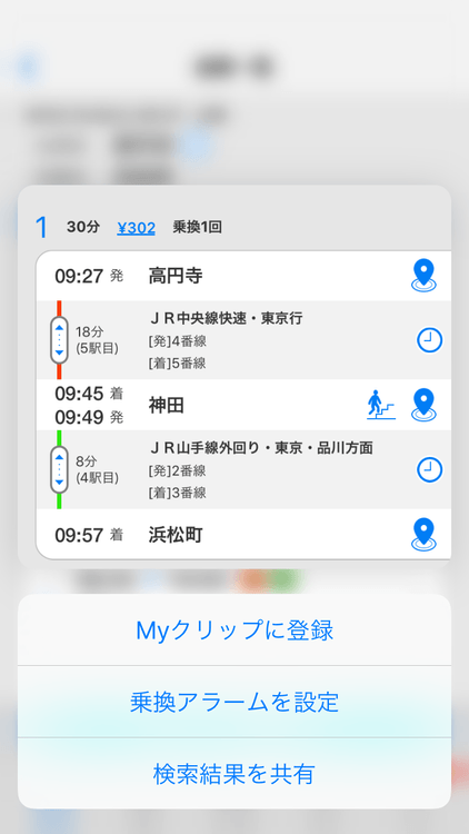 - 3の状態で上にフリックすると、「Myクリップに登録」「乗換アラームを設定」「検索結果を共有」メニューが表示・選択できます。