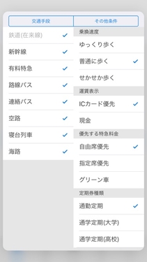 - 経路検索画面の「検索条件を変更する」を深く押し込むと、現在設定中の検索条件がプレビューできます。