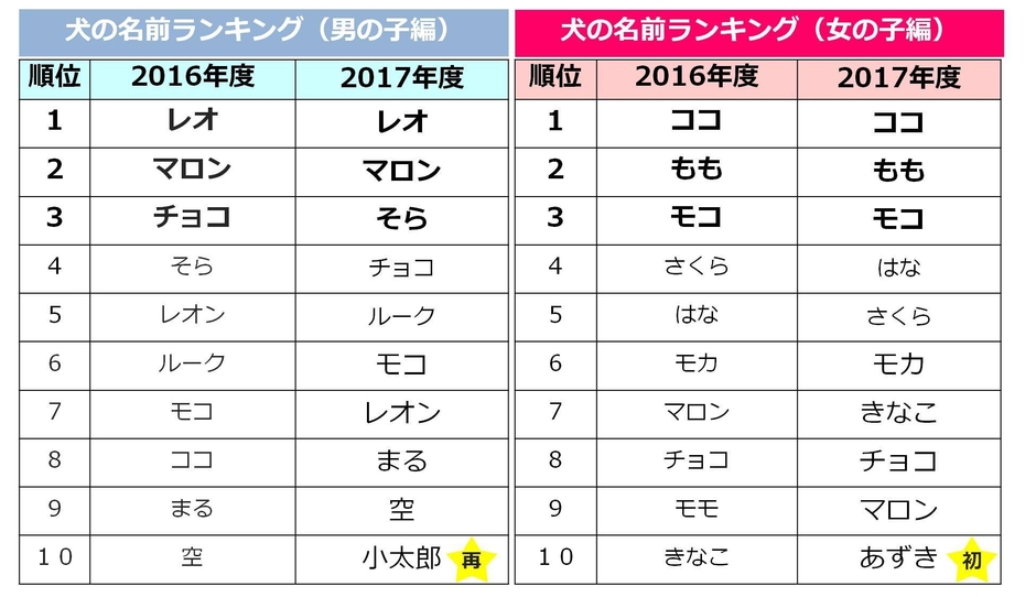 犬の名前を性別毎に集計したところ、男の子は「レオ」、女の子は「ココ」が1位と2016年度と同様の結果になりました。2017年度に新たに10位以内に入った名前は、男の子は「小太郎」(2015年度に9位にランクイン)、女の子は「あずき」となりました。ちなみに、10位以内では男の子の名前に多い「空」「小太郎」が漢字表記となりました。