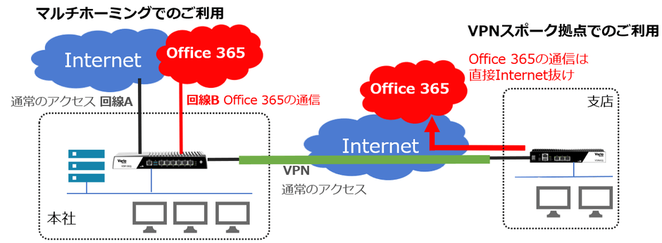 また、VSRによる拠点間VPN環境においては、スポーク拠点からハブ拠点へのOffice 365に関連する通信のみダイレクトにインターネットへ振り分けることで、ハブ拠点の負荷軽減とよりストレスの少ないOffice 365利用を実現します。