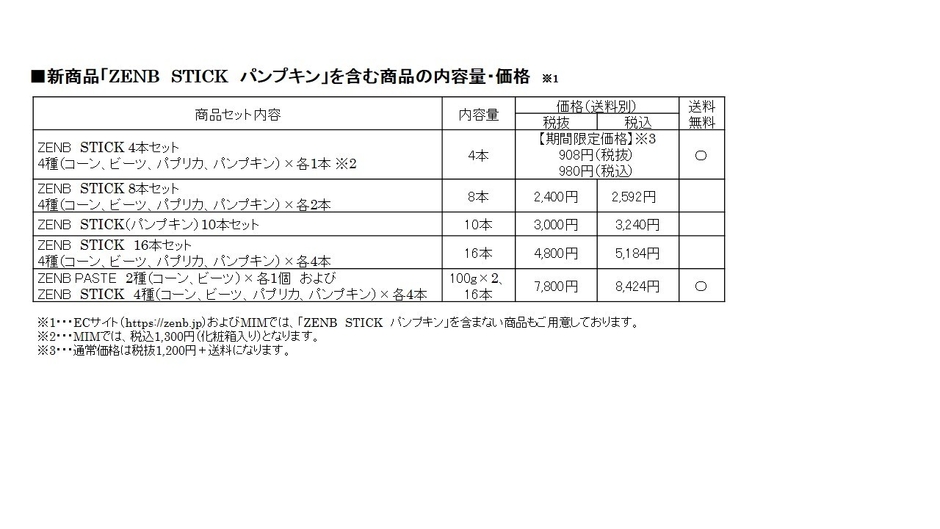 ※1…ECサイト( https://zenb.jp )およびMIMでは、「ZENB STICK パンプキン」を含まない商品もご用意しております。