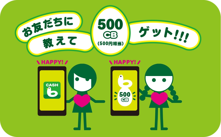 本キャンペーンは、『CASHb』をお友だちにも紹介したい!そう思ってくださるユーザー様へのお礼として、ご紹介くださるユーザー様に500CBを差し上げるものです。