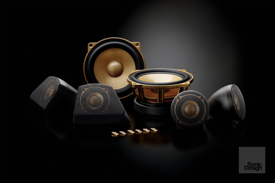 「SD-130GA」は、弊社の小型高性能スピーカーづくりのノウハウを汎用性の高いサイズに展開した130mm口径ウーファーユニットです。本格的なサブウーファーとしても、2~3ウェイシステム用のウーファーとしても使用できる卓越したワイドレンジ特性を持ち、もちろん「SD-N52GA」との組み合わせにも最適。超大型フェライトマグネットを投入したパワフルな磁気回路やアルミモノブロックフレームなど、ロングセラーユニットとして高い人気を誇った「SD-130R」の基本設計に、コーン部とセンターキャップ部の双方に最高品質のピュアアラミドを使用した専用設計のオールピュアアラミド振動板を組み合わせることで、低歪とスムーズな周波数レスポンス、そして全帯域にわたる高い分解能を実現します。またフレーム部には、振動板色とのマッチングを図ったゴールド塗装仕上げを施しました。本製品には、車内のお好きな場所に取り付けられるゴールド染色仕上げの専用ロゴバッジ(アルミニウム製・ダイヤカット加工)を1セットにつき2個ずつ同梱しています。