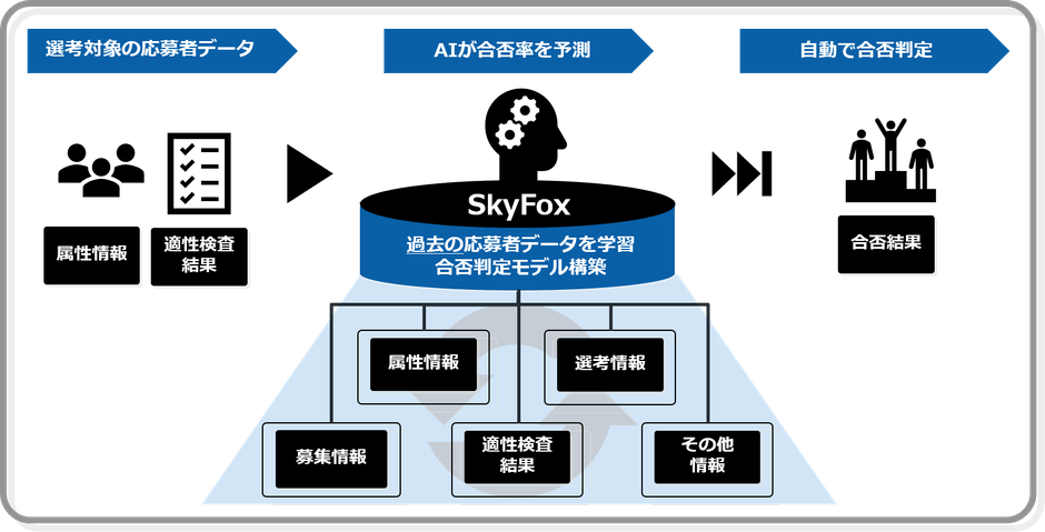 近年、採用市場におけるテクノロジーはめまぐるしく進歩しており、HRテクノロジーの分野ではさまざまなシステムや技術を用いたサービスが生まれています。エントリーシートによる合否判定を行うAI自動化サービスはすでに市場にありますが、今回リリースする「1st JUDGE (ファーストジャッジ)」は、エントリーシート以外の情報から合否を判定するのが最大の特徴です。既存のAIプラットフォーム「SkyFox」を活用することで、採用活動に無理なくAIを取り入れることができます。