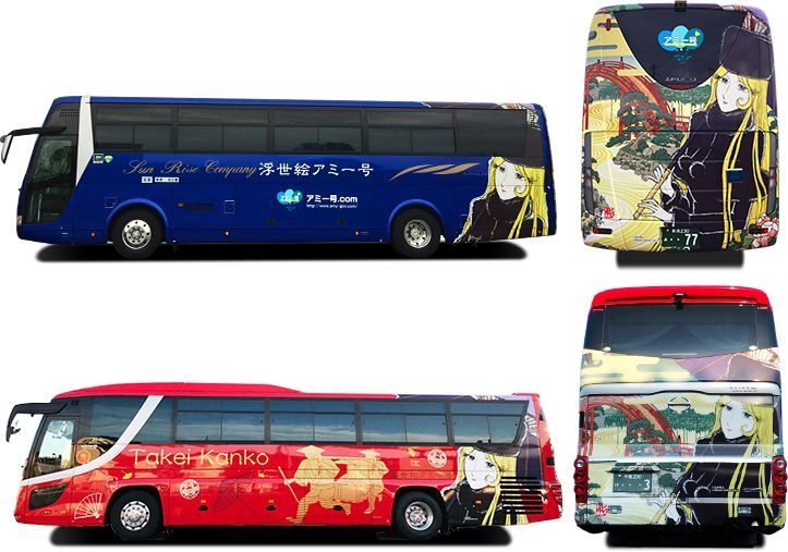 今回、5周年を記念して、乗車の記念にしていただけるようひろた組のひろたたけし氏の協力により、同氏が松本零士先生と手がけた「松本零士浮世絵コレクションシリーズ」から、「メーテル古都の休日」アミー号オリジナルバージョンのラッピングバスを運行します。アミー号の日頃のご愛顧に感謝してアミー号大阪便経由地である京都の浮世絵を背景に、中高年を中心に人気のある松本零士先生作銀河鉄道999のヒロインであるメーテルがお目見えします。