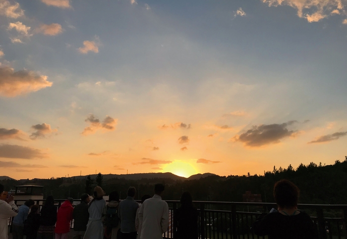 石川岳から昇る初日の出を拝み新年の幕開けを祝うひと時。初日の出を背に、お客様もご一緒に鏡開きを行います。