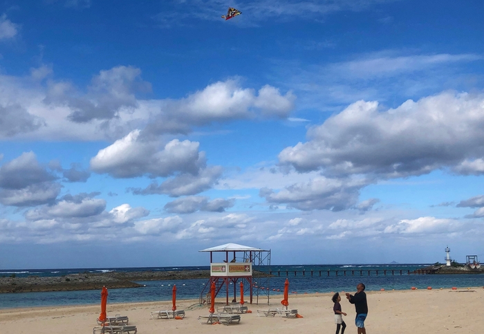 サンマリーナビーチで海を目の前に、凧揚げやコマ回しなどのお正月遊びをお楽しみください。