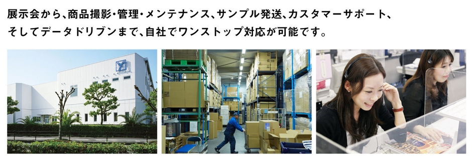 このようにブランドの立ち上げから、ECサイトの構築、販促活動、商談サポート、商品管理、物流業務、顧客対応まで自社で一貫して行い、ソフト面とハード面双方において、他社にはない当社独自のソリューションをご提供いたします。