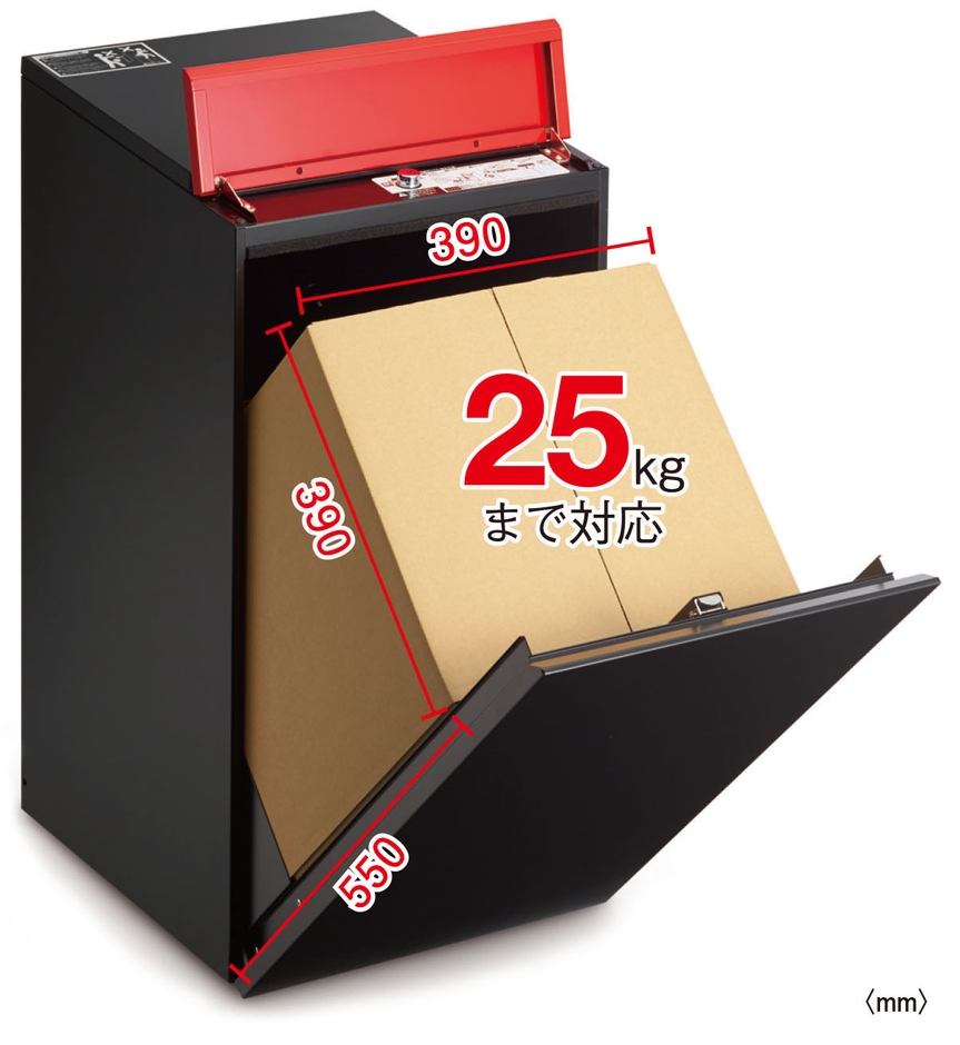 「戸建て住宅用宅配ボックス KBX-21BR型」は、完成品で納品され、面倒な組み立て工事や電気配線工事が不要。後付け設置可能な据え置き型で、屋外でも使える防滴仕様。解錠にはセキュリティ性の高い専用ディンプルキーを採用。最大受取可能サイズ390×390×550mm・対応荷物重量25kgまで可能な大容量タイプ。