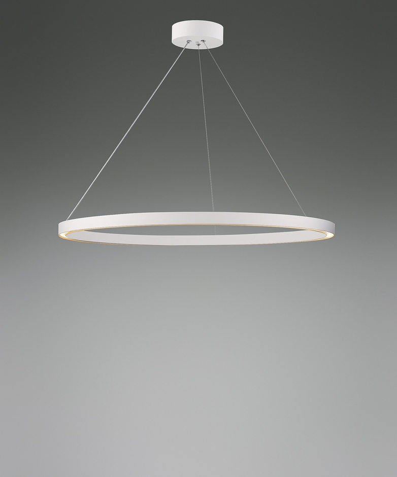 シンプルなデザインとクオリティを追求したリング型調光シャンデリア。発光面は、灯具内部の粒感を隠す為にシリコン素材を使用し、眩しさを感じにくいフラットな「光の輪」を実現しました。発光面の側面は、テーパーを施し、ソリッドでシャープな印象を与えるデザインとなっております。3サイズ展開で(Φ1000/Φ800/Φ600)空間のボリュームに合わせてサイズをお選び頂けます。また色温度は、3色展開で(2700K 電球色/3500K 温白色/5000K 昼白色)専用調光器を設ければ100%~約1%まで調光が可能です。電源線自体が吊具として機能するように工夫し、フランジ部分のデザインもシンプルにする事で灯具を引き立たせ、空間の邪魔をしない設計となっております。
