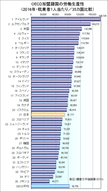 - 日本の1人当たり労働生産性は、81,777ドル。OECD加盟35ヵ国中21位。