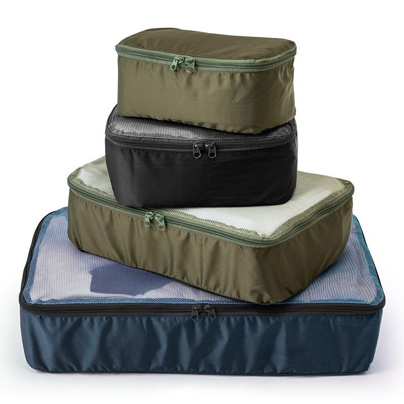 シャンプーなどの小物を入れるSS、衣類用のS/M/L、計4サイズのセットです。シワになりにくい光沢ポリエステルを採用。