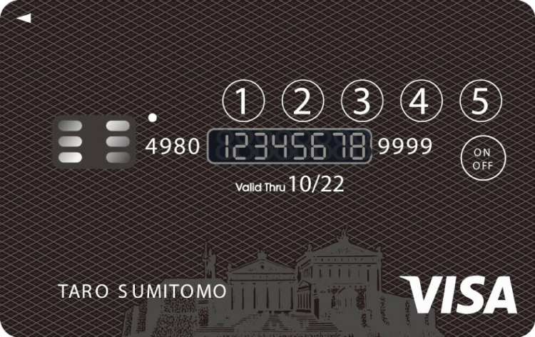 新型カードにはLEDランプや液晶、番号を入力するタッチ式ボタンが搭載されており、カードを利用する都度、カード上のタッチ式ボタンでお客様自身が設定したパスワードを入力して起動させます。起動させると液晶にカード番号が表示され、表示中のみ、磁気ストライプ・ICチップの機能がアクティベートされ、店頭決済はもちろん、インターネット決済でもカードを利用することができます。カード利用後は、液晶のカード番号が非表示となり、磁気ストライプ、ICチップの機能が停止するため、カードが利用できなくなります。