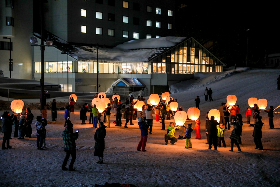 本施設の冬の恒例行事となっている小型熱気球「空飛ぶランタン」の打ち上げを2020年も実施しております。東日本大震災や新潟・長野県境地震の復興を祈願し2012年に開始。毎年ゲレンデに多くのカップルや家族連れが詰めかけ、それぞれ願いを込めたランタンを夜空へ放ちます。空飛ぶランタンが柔らかな光で白銀の世界を彩る光景は、幻想的で美しいと多くの方からご好評をいただいております。