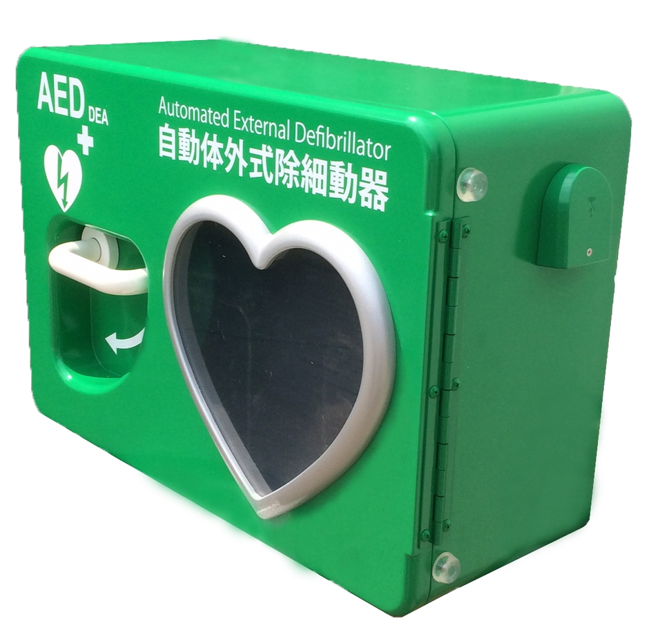 AED(自動体外式除細動器)の主なメーカーの動作保証環境温度は50度以下であり、直射日光の当る屋外では、収納ケース内の温度が高温になる事から設置は困難とされていました。