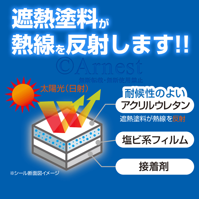 耐候性の良いアクリルウレタンが熱線を反射します。製品未使用時と比べると、温度上昇を約24℃抑えることが出来ます。