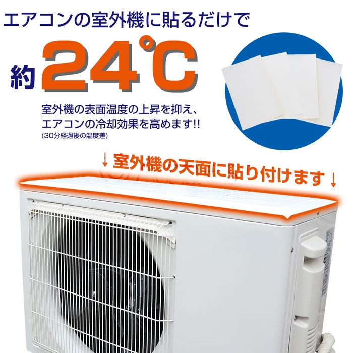 室外機の天面に貼り付けるだけで、約24℃も表面温度の上昇を抑えて、エアコンの冷却効果を高めます。