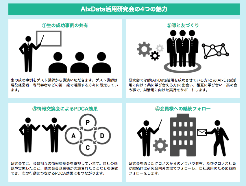 という2つが有効であると考え、これらを実現するための会員制コミュニティ「AI×Data活用研究会」を発足するに至りました。