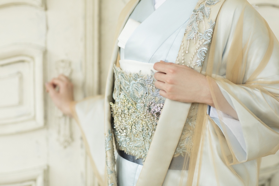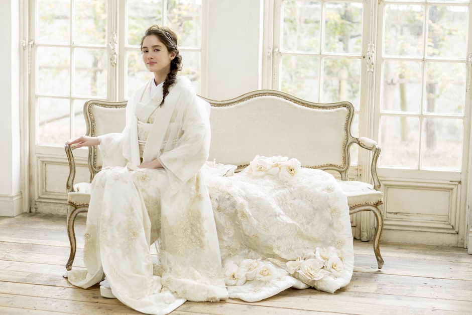 「Couture Garden 結」のコレクションは、全作を通して会場のテイストの和洋を問わずご着用いただけます。バックスタイルの美しい和装は、ドレスのトレーンさながらに教会のバージンロードにも映えるようデザインしております。また、新郎様の衣裳も紋付袴に限らず洋装を合わせていただくこともでき、新しい和装スタイルを取り入れたい花嫁様に、是非お試しいただきたいコレクションです。