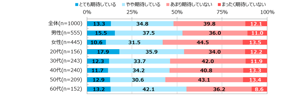 ・性別でみると、「期待している」と回答した人は、男性では53.0%、女性では42.1%と10ポイント以上の差が見られました。