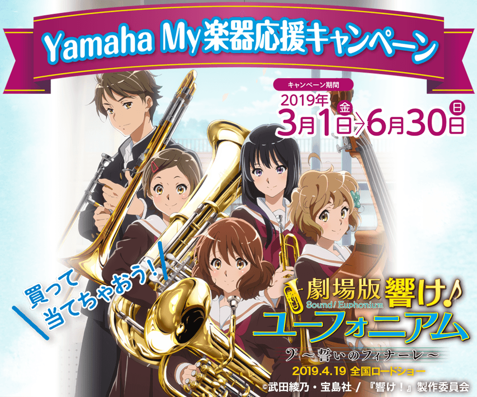 株式会社ヤマハミュージックジャパン(本社:東京都港区、代表取締役社長:押木正人)は、2019年4月19日公開の『劇場版 響け!ユーフォニアム~誓いのフィナーレ~』とタイアップし、ヤマハ、アレキサンダー、モースマン(*1)の管楽器を購入した方に、抽選でアーティストの個人レッスンや『劇場版 響け!ユーフォニアム』の関連グッズなどをプレゼントする「Yamaha My楽器応援キャンペーン」を2019年3月1日(金)から6月30日(日)まで実施します。