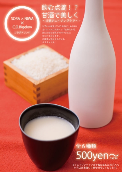 甘酒を使ったドリンクをはじめ、8種類のメニューを提供。さらに12月16日(土)・17(日)には『C.O.BIGELOW』ボディークリームを使用したハンドマッサージ体験も開催します。